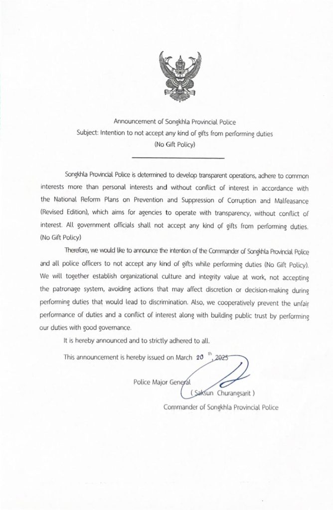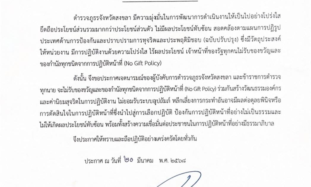 ประกาศ เจตนารมณ์ที่จะไม่รับของขวัญและของกำนัลทุกชนิดจากการปฏิบัติหน้าที่ 25 มีนาคม 2025 โดย admin / ข่าวประชาสัมพันธ์,ข่าวกิจกรรม,ข่าวประชาสัมพันธ์,ข่าวภารกิจผู้บังคับบัญชา